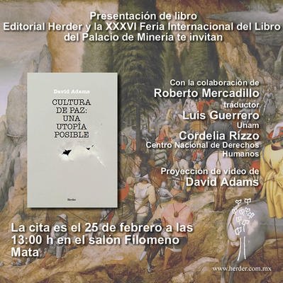 Editorial Herder y la XXXVI Feria Internacional del Libro del Palacio de Minería te invitan a la presentación del libro Cultura de paz: una utopía posible del autor David Adams, el día 25 de febrero a las 13:00 h en el salón Filomeno Mata.